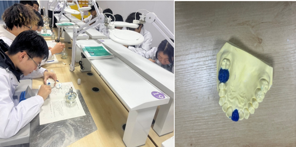 实训前,口腔医学技术专业教师陈淑梅根据项目所需,制定并下发实训指导书,实训教学中,学生分组讨论塑形步骤、积极开展分工协作,教师耐心指导规避常见问题,如蜡型气泡、形态偏差。