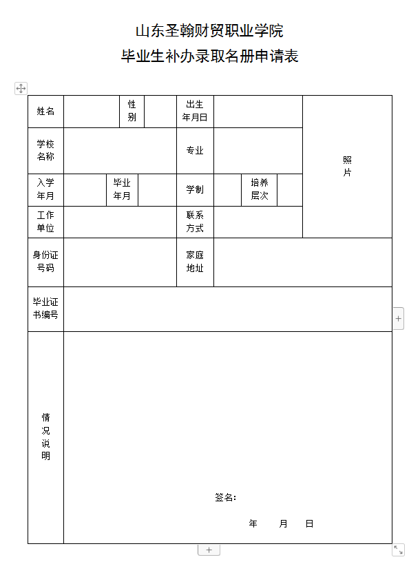1.填写《山东圣翰财贸职业学院毕业生补办录取名册申请表》(手写)。