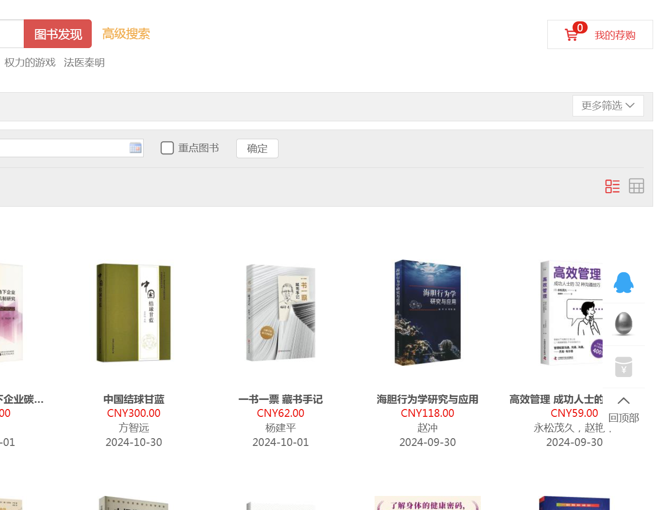 1.1、平台可按图书的出版时间、定价排序。也可按价格区间、出版时间段、重点图书【即图书馆关注的重点出版社】进行筛选。