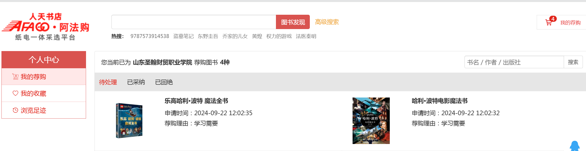 3、我的荐购:【个人中心】→【我的荐购】 中可查看到所有的荐购书目,及图书馆的采纳情况。