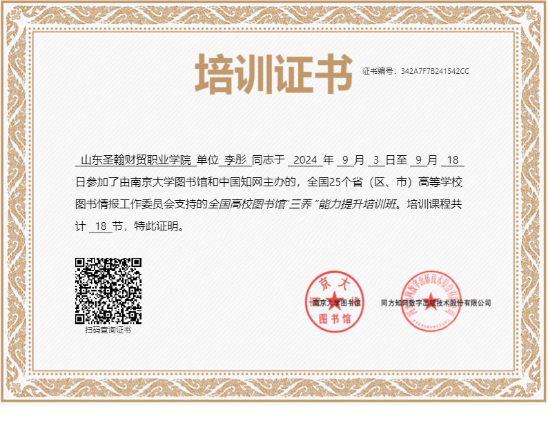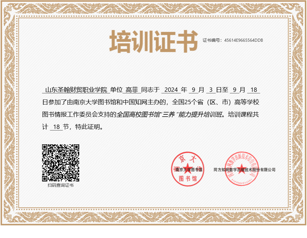 全体馆员以高度的积极性投入到此次培训之中,认真研习。截至10月30日,所有馆员均已圆满完成培训任务,并顺利通过考试,取得学习证书。此次培训成效显著,切实提高了馆员们的信息素养、学术素养和人文素养,不仅为学校图书馆工作的创新发展贡献了宝贵经验与思路,也为向师生读者提供高质量服务提供了坚实保障。