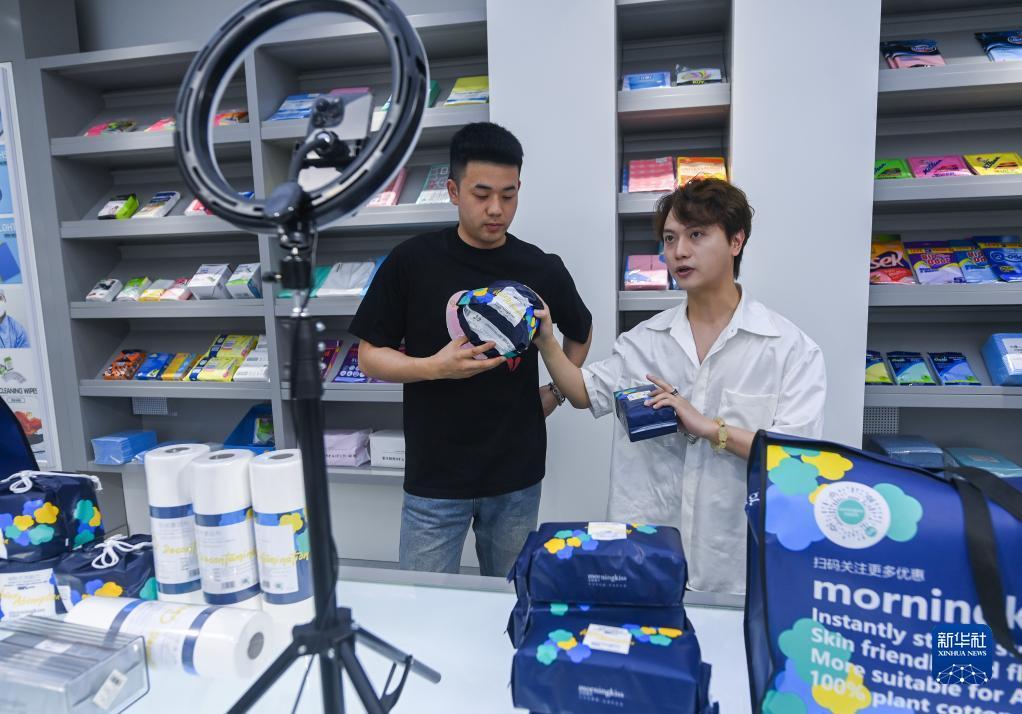 7月21日,在位于杭州市临安区高虹镇的浙江晨阳无纺布科技有限公司展厅内,沈屹航(右)在直播推荐产品。沈屹航是“95后”归国留学生,回到家乡后,通过电商直播的方式推动无纺布产品拓展新的销售渠道。