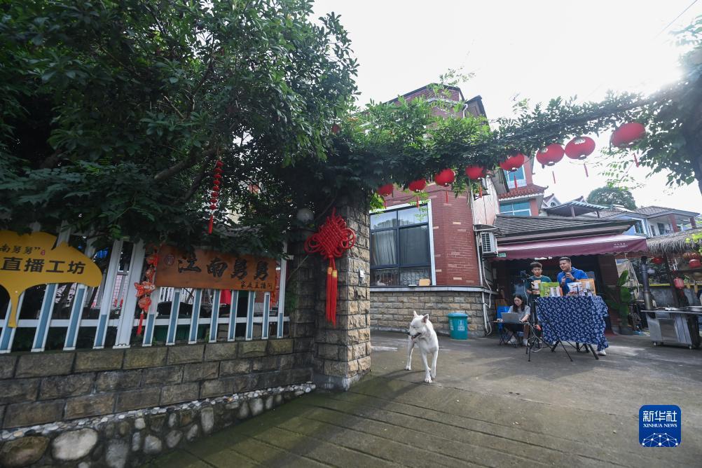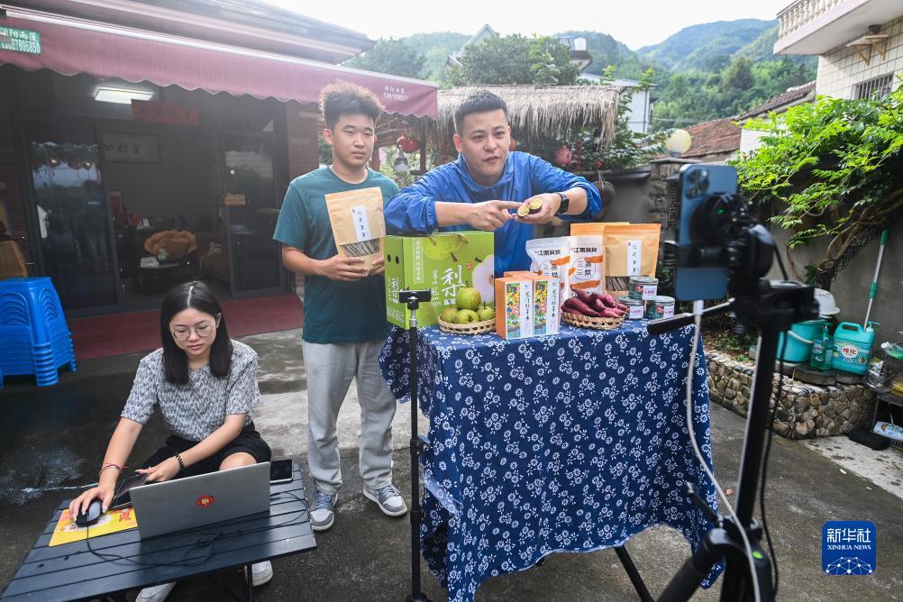 7月21日,在杭州市临安区高虹镇崇阳村,何江南(右)和搭档在直播销售当地土特产。何江南回乡后通过短视频创作加带货直播形式,宣传家乡美食美景,实现村级土特产销售和村民收入双提升。