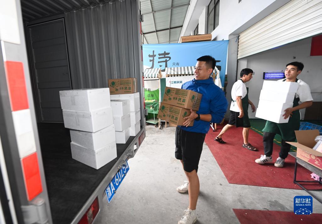 7月21日,在杭州市临安区高虹镇崇阳村,返乡创业的何江南(左)和村民一起装车发货。何江南回乡后通过短视频创作加带货直播形式,宣传家乡美食美景,实现村级土特产销售和村民收入双提升。