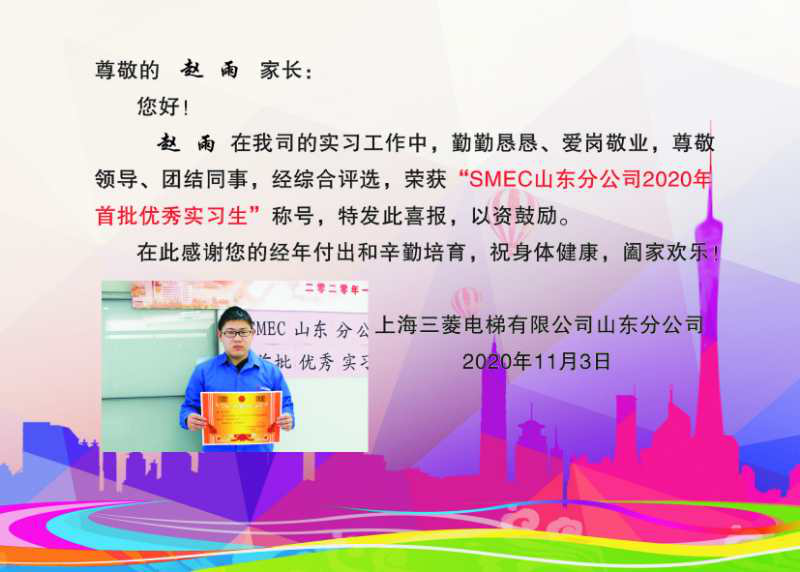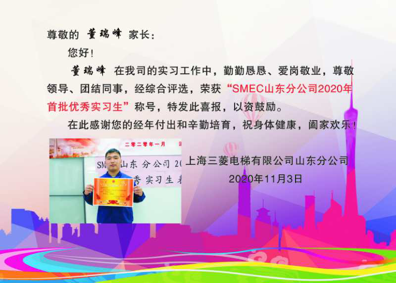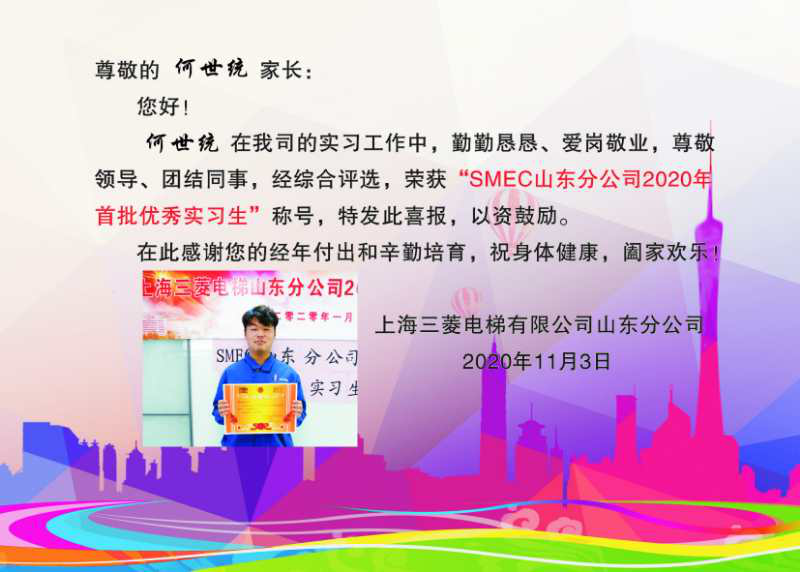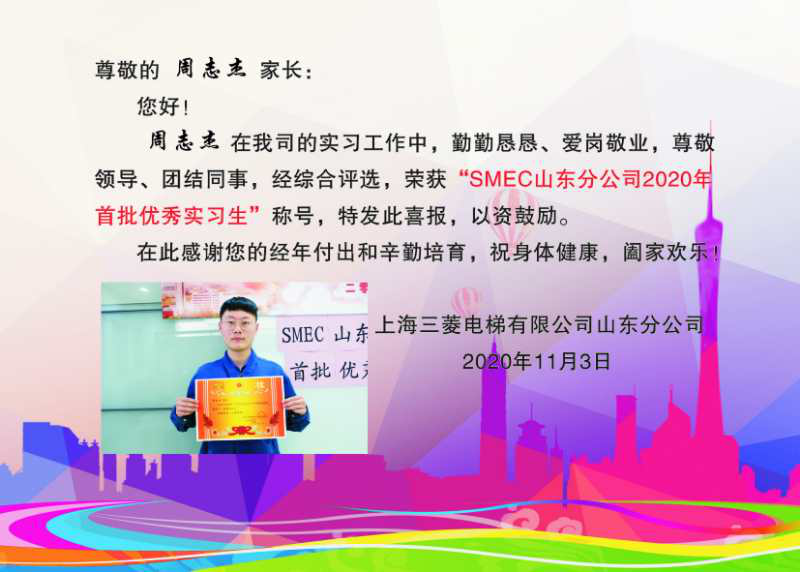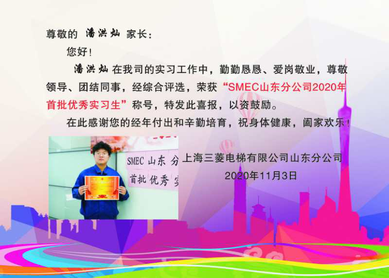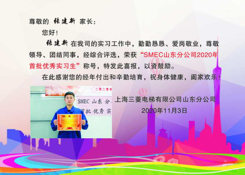 2020年11月3日,上海三菱电梯有限公司山东分公司在山东泰安,对本季度实习优秀学生进行表彰,经综合评选,山东圣翰财贸职业学院实习生董瑞峰、何世统、潘洪灿、张建新、赵雨,周志杰6名同学荣获“SMEC山东分公司2020年首批优秀实习生”称号。企业为获奖实习生精心制作表彰证书,通过邮寄的方式发给实习生父母,让家长见证到自己孩子的成长。