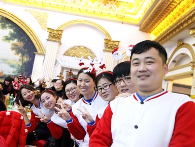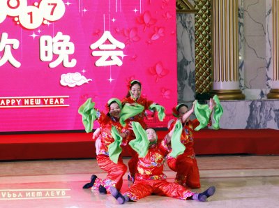 表彰环节之后,全体教职工为大家带来了一场别开生面的文艺演出。建筑工程学院教职工带来的舞蹈《咱们屯里的人》,亲切、阳光、而又热烈,让全场领导、老师迅速融入了晚会积极向上的氛围之中。随后,俏皮、可爱的舞蹈《回娘家》,振奋人心的歌舞表演《相亲相爱》,动感、活泼的舞蹈《青春修炼手册》,《大王叫我来巡山》、《不如跳舞》,优雅、婉转歌舞表演《女儿情》以及交谊舞环节,时尚、富有感染力的迪斯科,则一次次地将整场晚会推上了高潮,充分展现了我校教师能文能武、多才多艺、积极向上的良好精神风貌。晚会期间,校领导还多次亲自参与到节目互动中,让大家倍感亲切。晚会最后,吉木校长扮演的“圣诞老人”一出场,更是又一次引爆全场,全体教职工争相领取小礼物,并与“圣诞老人”合影。
