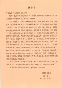 近日,保利大厦收到中国中化集团客人的表扬信。客人在信中对保利大厦前台礼宾部员工李珈庆不顾自身安危,危急时刻将已经在扶梯上摔倒的两名老人扶起的行动表示衷心感谢。