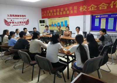 2018年8月27日,山东圣翰财贸职业学院,财贸院王延军院长,李磊副院长到山东天赋大业税务师事务所看望正在实习的学生们。