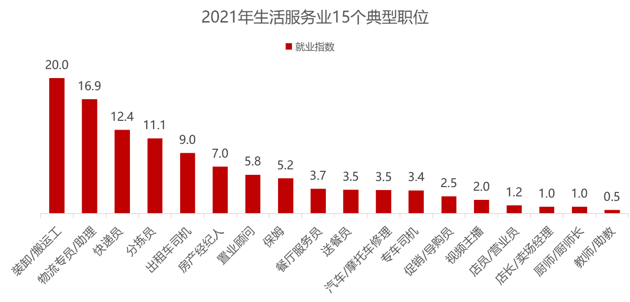 进一步挑选生活服务业中的15个典型职位观察发现,从发展来看,2021年装卸/搬运工、物流专员/助理、快递员、分拣员等职位就业指数最大,用工最紧缺,位居前四位。出租车司机、房产经纪人、保姆、专车司机等围绕居民衣食住行的职位招聘规模上升较快,且存在一定的求职门槛,所以就业指数相对较高。而送餐员、促销/导购员职位则因人员流动性较高,致使就业指数偏高,长期存在用工缺口。
