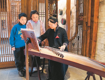 4月9日,在安徽省黟县石亭村的民宿“拾庭画驿”内,民宿管家在为小朋友演奏传统乐器。新华社记者 马 宁摄