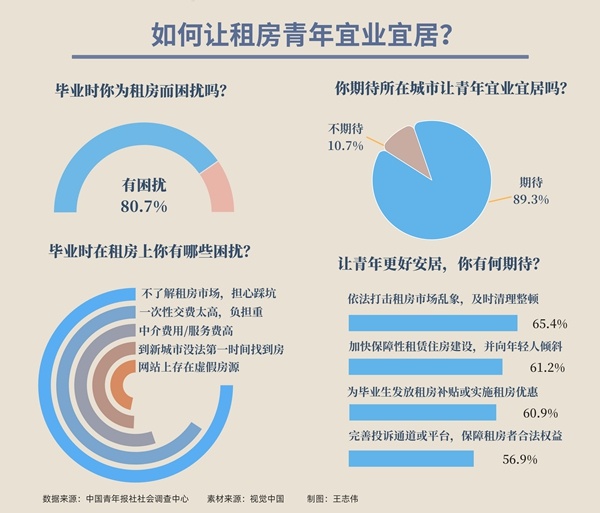 调查显示,让青年更好安居,65.4%的受访者认为应依法打击租房市场乱象,及时清理整顿,61.2%的受访者期待加快保障性租赁住房建设,并向年轻人倾斜,60.9%的受访者希望为毕业生发放租房补贴或实施租房优惠。