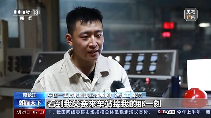 中国一重铸锻钢事业部炼钢厂冶炼工 张航:看到我父亲来车站接我的那一刻,我觉得我父亲头发白了,然后我觉得不应该在外面漂了,应该在家落地生根。我觉得就是看着父母年纪变大了,觉得想为家庭承担一份责任。