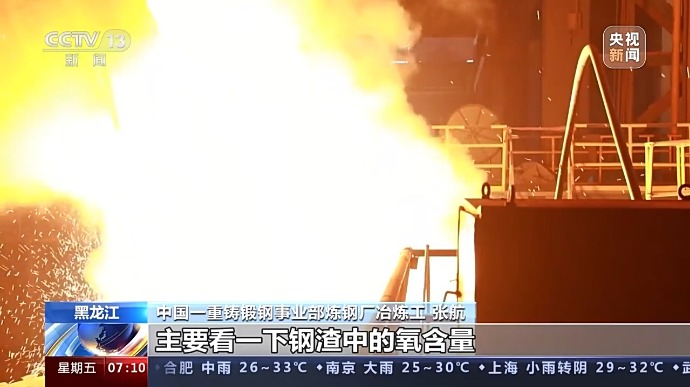 中国一重铸锻钢事业部炼钢厂冶炼工 张航:主要看一下钢中的氧含量,因为要把钢渣中的氧含量降到最低。