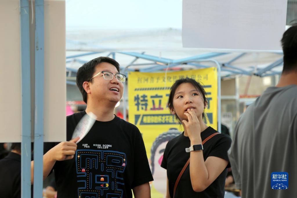 7月15日晚,求职者在云南省红河哈尼族彝族自治州蒙自市大树寨的“青年人才夜市”招聘会现场查看岗位信息。