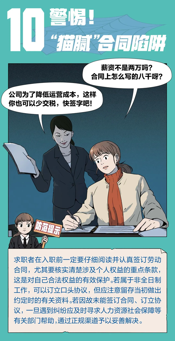今天推出防范求职招聘风险公益宣传漫画第十期——警惕“猫腻”合同陷阱。