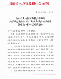 山东省人社厅关于举办山东省2017年秋冬季高校毕业生就业集中招聘的通知
