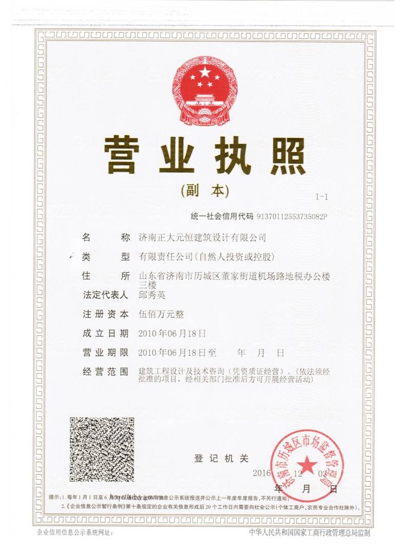 济南正大元恒建筑设计有限公司是一家以设计为龙头的科技型企业,业务范围涵盖前期咨询、建筑规划、工程设计、景观园林、项目管理等领域,具有经住建部审批的建筑行业建筑工程甲级资质。 公司注册资本金500万元,拥有一支由资深设计师组成的优秀设计团队,其中国家一级注册建筑师4人,国家一级注册结构师3人,注册电气工程师1人,注册设备工程师2人,高级工程师4人,工程师24人,专业技术人员35人,技术力量雄厚,专业配套齐全,设有建筑、规划、结构、暖通空调、给排水、电气、景观园林等专业,可承担大型公共建筑及民用建筑设计、规划设计、装饰设计、景观设计、建筑智能化设计、工程技术咨询、彩图、动画、多媒体制作等业务。 公司一贯注重设计质量,坚持精心设计、技术创新。公司自创立以来,承接了多项大中型民用与工业项目设计,先后完成了济南正大城市花园、正大时代广场、章丘百脉豪庭、章丘城市中心商贸综合体规划、东营中凯汽车会展中心、菏泽监狱指挥中心、凤凰山国际广场、肥城盛世桃都商住楼、平阴正大天汇翠庭、东平城市花园、宁津太合公馆住宅小区、仲宫文景苑、章丘东城花苑、山东永续置业汶上项目及山东冠世针织有限公司厂区等项目的工程设计,以优质的设计,优良的服务,赢得了建设单位与社会的一致认可。