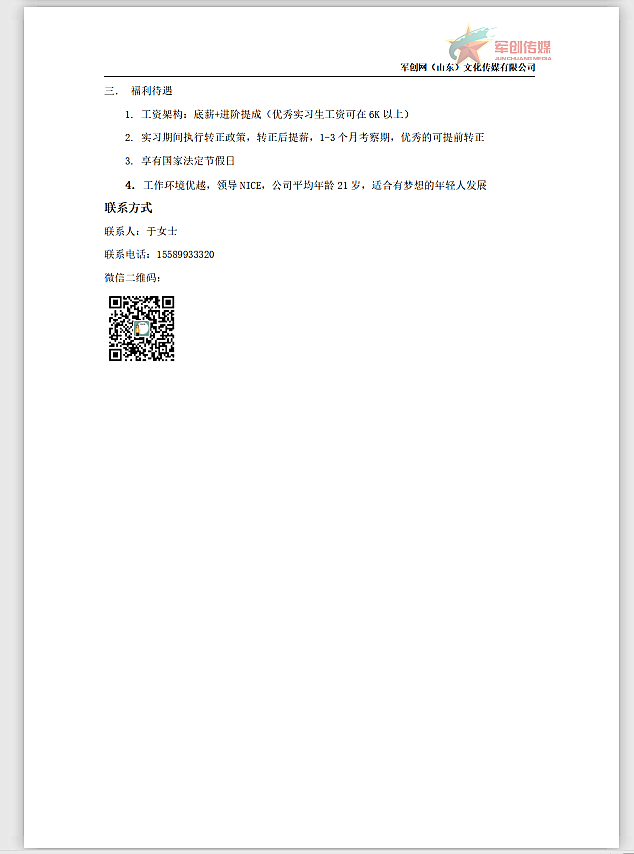 军创网文化传媒有限公司招聘启事