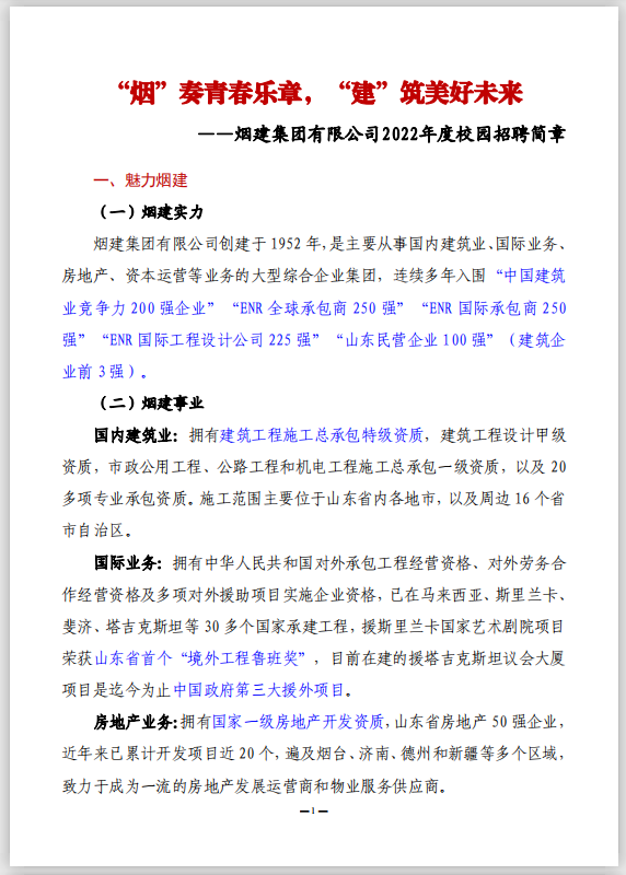 烟建集团有限公司2022年校园招聘