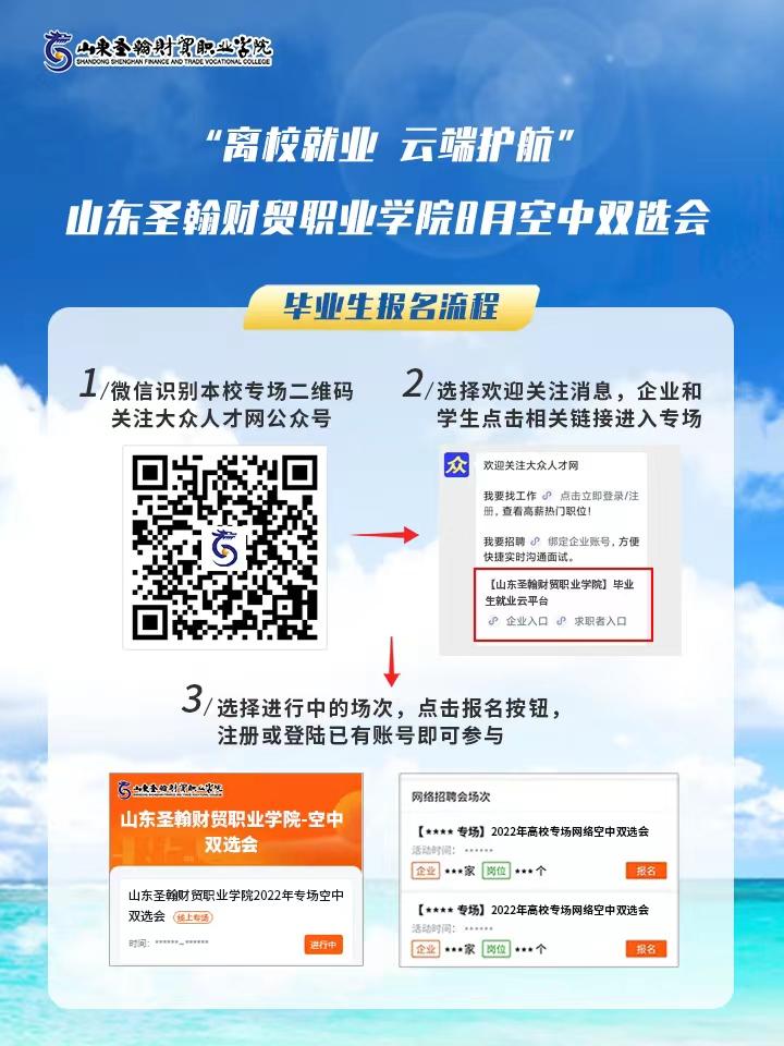 手机微信扫码关注“大众人才网”微信公众号,企业和毕业生分别点击相关按钮进入山东圣翰财贸职业学院校招端口,点击报名按钮,注册或登录已有账号即可直接参与。