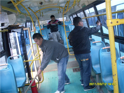 3月14日上午,在建筑工程学院学生会主席团成员的带领下,十几名大一学生会成员前往公交运营中心为86路公交车打扫卫生。