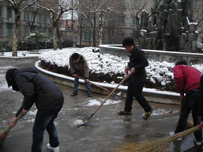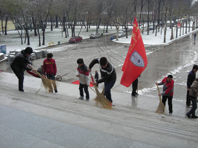 2011年11月30日,济南的第一场雪给大家带来了喜悦的同时也给大家带来的不安全因素,路滑容易使人摔跤。工商管理学院学生会成员在团委书记杨朝霞老师的带领下,自觉集合在一起,进行校园扫雪活动,为我校师生扫清积雪,安全行走。