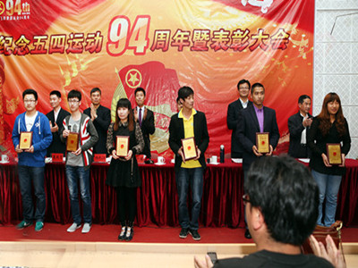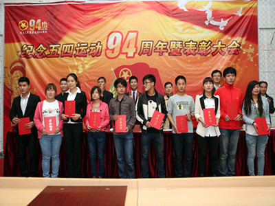 红旗飘动,团徽闪耀。2013年5月9日下午四点,我校纪念五四运动94周年暨表彰大会在D5报告厅隆重举行。校长刘广耀、常务校长戈进杰教授、党委常务书记、副校长杨长江研究员,校长助理司赞,学生处袁延青处长,学生处李炳明副处长,各二级学院院长和团委负责人以及500余名团员代表参加了本次大会。表彰大会由校团委副书记李兆臣主持。