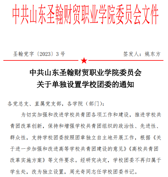山东圣翰财贸职业学院团委积极落实《关于进一步加强和改进高等学校共青团建设的意见》、《高校共青团改革实施方案》等文件要求,在学校党委和学校领导的大力支持下,于今年3月27日下发红头文件,将校团委单独设置,下设团委办公室、组织部、校园文化活动部、志愿服务与社会实践部四个部门,二级学院团组织架构健全,配有专门的二级学院团总支书记开展共青团工作。