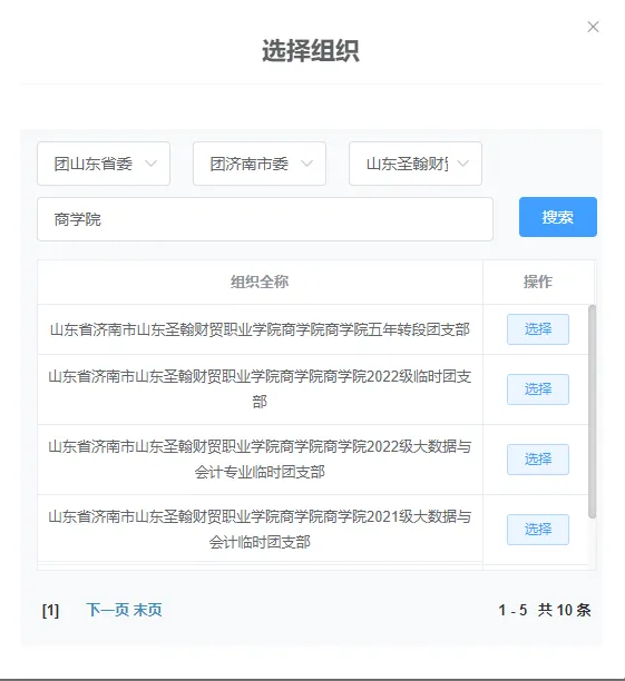 要转到山东圣翰财贸职业学院商学院2024级财务管理1班团支部,那么需要依次选择【团山东省委】【团济南市委】【山东圣翰财贸职业学院团委】,再输入自己学院的名称,在下面找到后点击选择。切记不要直接选择转入“山东圣翰财贸职业学院团委”,否则无法后期查询团员信息。