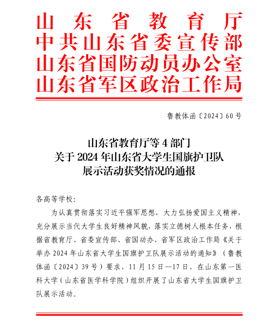 近日,在山东省教育厅、中共山东省委宣传部、山东省国防动员办公室、山东省军区政治工作局举办的“逐国旗荣光,承青春使命”大学生国旗护卫队展示活动中,我校国旗护卫队积极备赛,通过58天的刻苦训练,最终荣获团体二等奖,马长恩同学荣获标兵升旗手,张瀚文同学荣获队列标兵,刘军凯荣获优秀指导老师称号。此次比赛竞争激烈,全省143余所高校的国旗护卫队参与其中。同学们不畏强手,以整齐的步伐、标准的动作、昂扬的精神风貌脱颖而出,全方位展现出我校学子朝气蓬勃、积极向上的精神风貌和浓厚的爱国热情。
