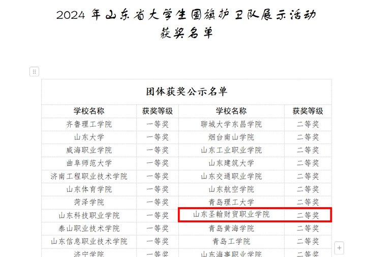 山东圣翰财贸职业学院国旗护卫队成立于2022年9月,在学校团委指导下开展工作,肩负学校每天升降国旗及重大节日、庆典的升旗仪式任务,展现出山东圣翰财贸职业学院传承红色血脉、担当历史使命的风采英姿,成为校园里“行走”的国防教育名片。此次荣誉的获得,是我校国旗护卫队全体队员共同努力的结果,也是学校高度重视国防教育和爱国主义教育、积极营造良好校园文化氛围的生动体现。
