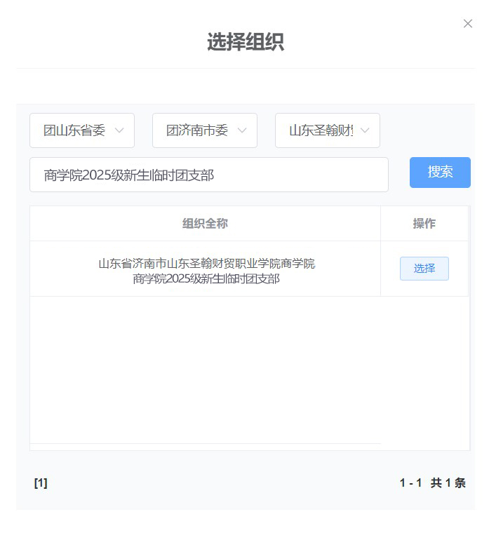 例:如被山东圣翰财贸职业学院商学院录取,那么需要依次选择【团山东省委】【团济南市委】【山东圣翰财贸职业学院团委】,再输入名称【商学院2025级新生临时团支部】,点击【搜索】,点击【选择】。请务必输入正确的支部名称,不要转错支部,否则后期将无法查询到自己的团员信息。