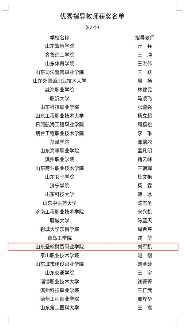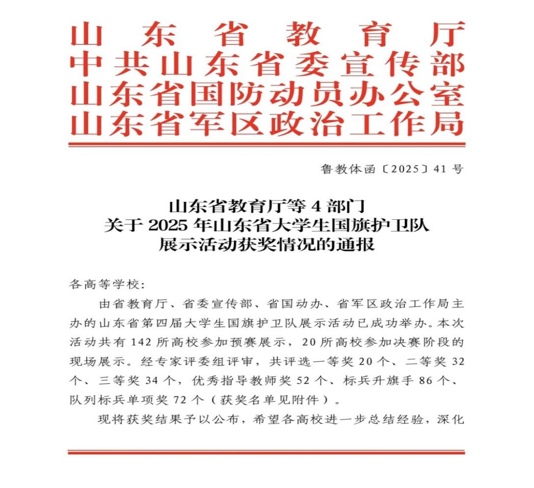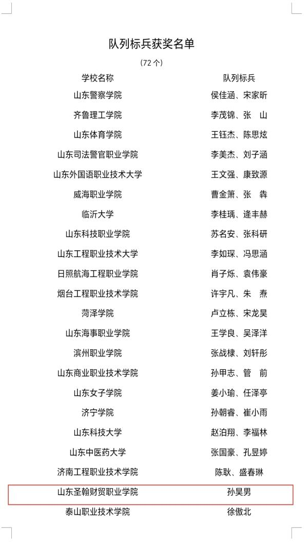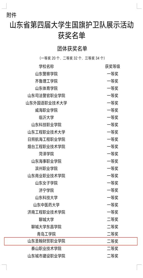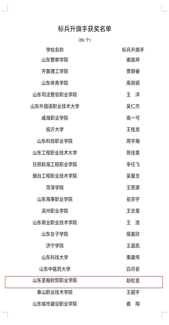 近日,山东省教育厅、中共山东省委宣传部、山东省国防动员办公室、山东省军区政治工作局主办的第四届山东省大学生国旗护卫队评选结果正式揭晓,山东圣翰财贸职业学院国旗护卫队在全省142所高校参赛队伍中脱颖而出,以第24名的成绩荣获团体二等奖,较去年排名提升3位,赵松言荣获优秀标兵升旗手、孙昊男荣获优秀队列标兵、刘军凯荣获优秀指导教师称号;充分展现了圣翰学子昂扬向上的精神风貌。
