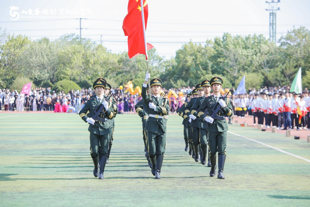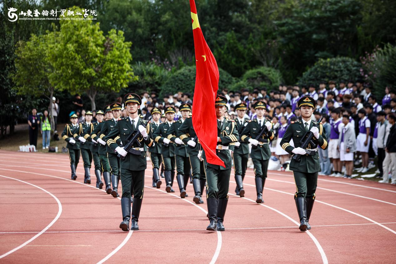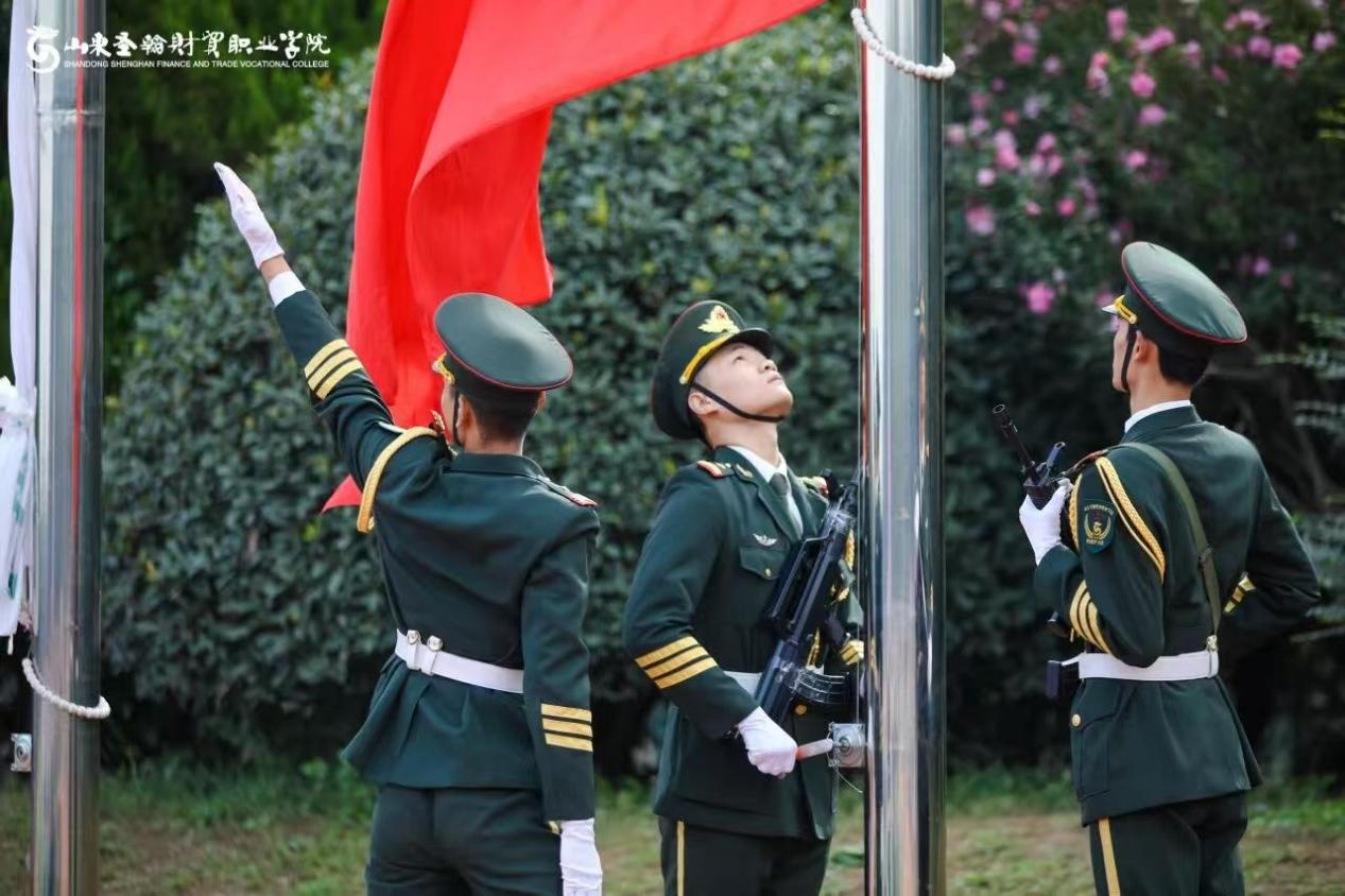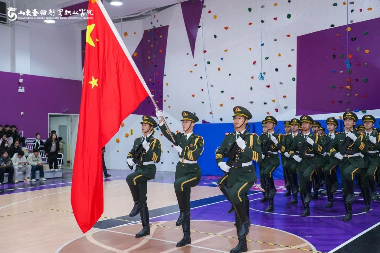 山东圣翰财贸职业学院国旗护卫队自2022年组建以来,始终以“护我国旗、扬我国威”为使命,以“纪律严明、作风过硬、动作规范、精神饱满”为标准,在日常训练中精益求精。队员们利用课余时间,克服学业与训练的双重压力,反复打磨齐步、正步、升旗动作——从摆臂高度到踢腿角度,从眼神专注度到队列整齐度,每一处细节都力求精准;在思想建设上,队伍定期开展国旗知识学习、爱国主义主题分享等活动,让“尊重国旗、守护国旗”的信念深植于每一位队员心中,真正做到“形”“神”兼备。