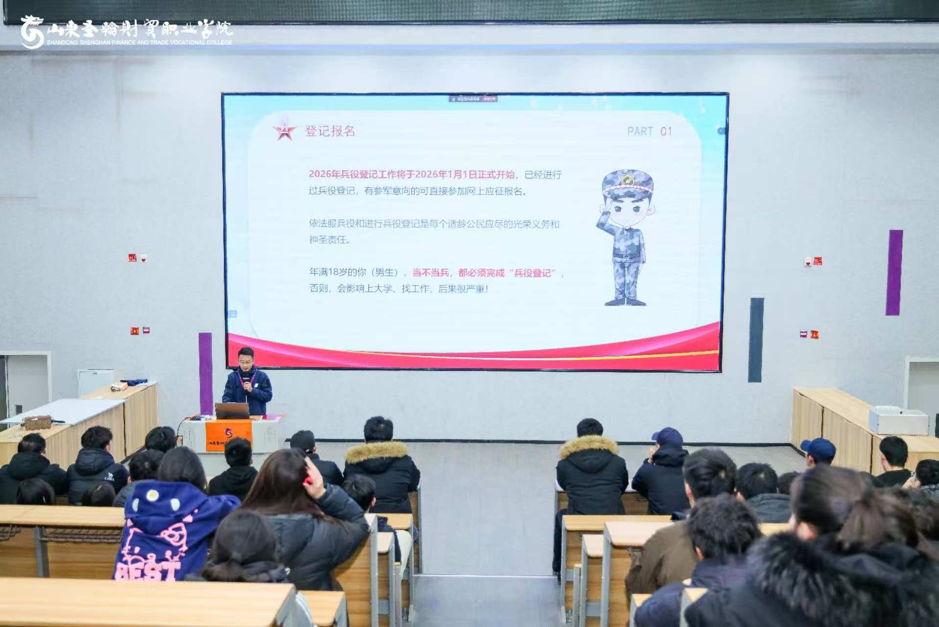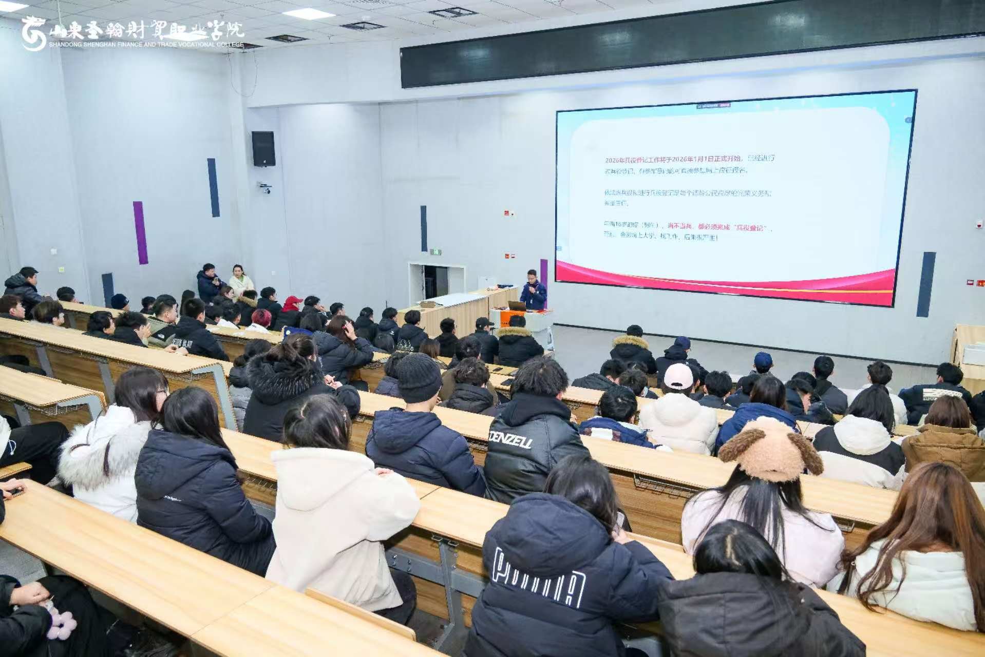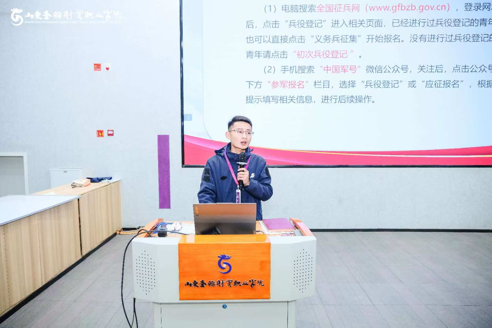 为深入贯彻上级征兵工作部署,激发青年学子爱国拥军、投身军营的热情,1月8日,山东圣翰财贸职业学院在吉纯楼第四报告厅召开2026年征兵政策讲解暨动员大会。学校团委、征兵工作站刘军凯担任主讲,各二级学院、校级组织学生代表及大三实习学生线上线下共300余人参加会议。