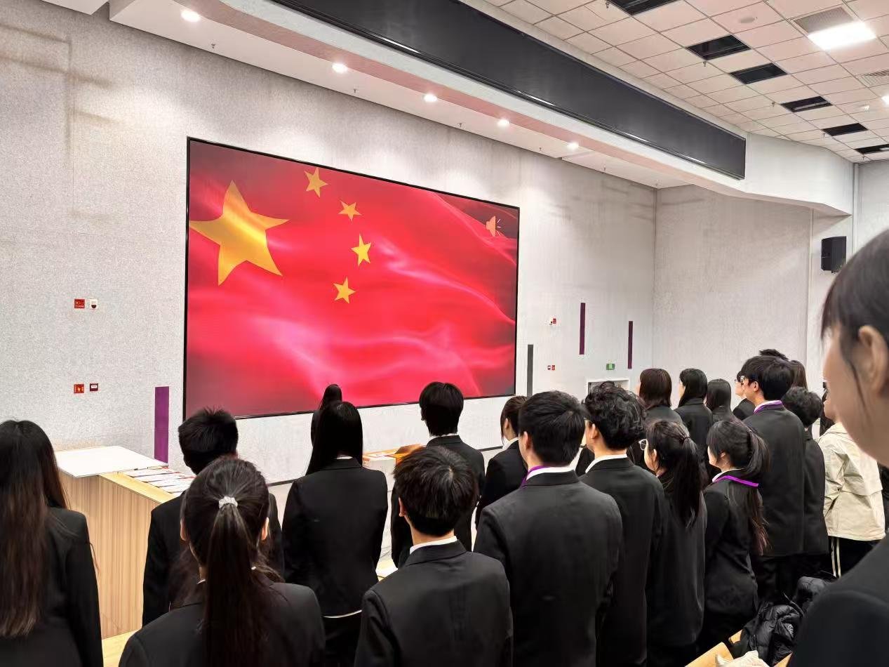会议在庄严的国歌声中拉开帷幕。全体成员肃立齐唱,现场庄重肃穆,充分展现了我校青年学子爱党爱国、昂扬向上的精神风貌。