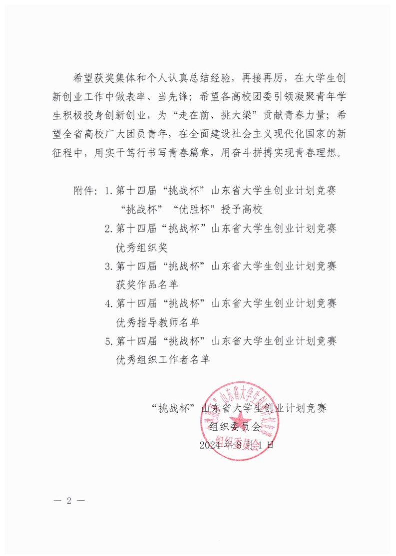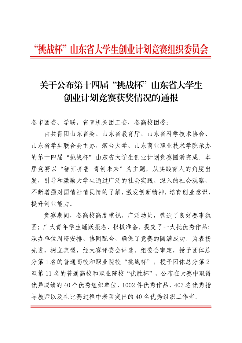 关于公布第十四届“挑战杯”山东省大学生创业计划竞赛获奖情况的通报