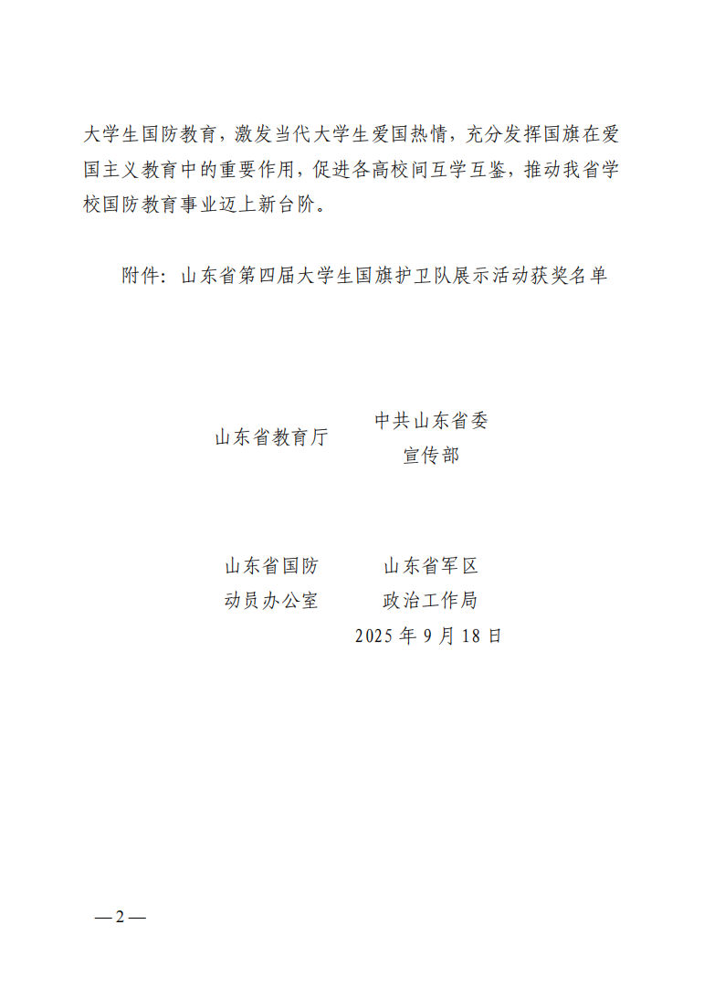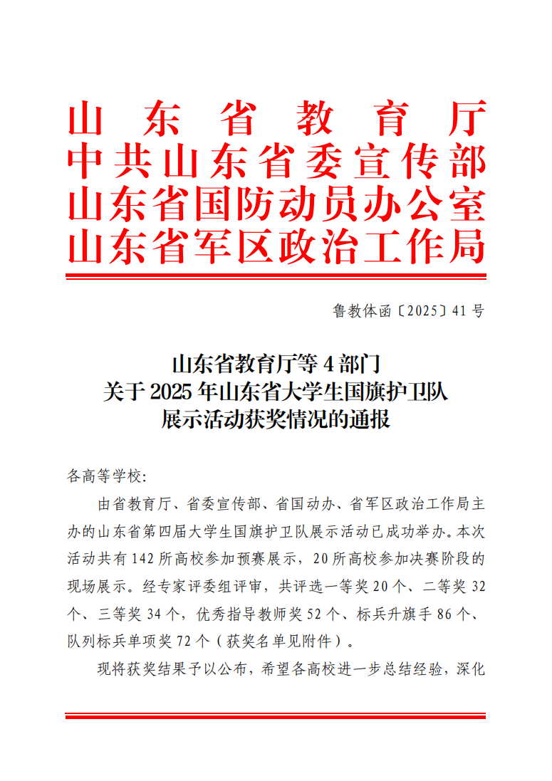 山东省教育厅等 4 部门 关于 2025 年山东省大学生国旗护卫队 展示活动获奖情况的通报