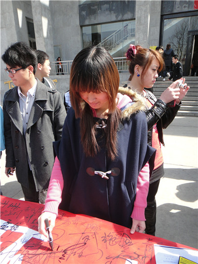 膳堂门前人头攒动,在活动火热气氛的感召下,老师及同学们纷纷踊跃上前,在“共创文明就餐环境”的条幅上写下了自己的名字,以表文明就餐从我做起的决心;同时在膳堂二楼,开展了宣读“共创文明就餐环境”倡议书活动,提醒学生有序就餐并主动将餐后用具主动放回餐盘回收处。