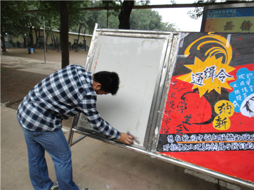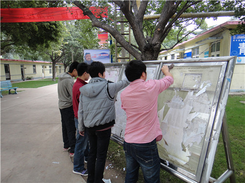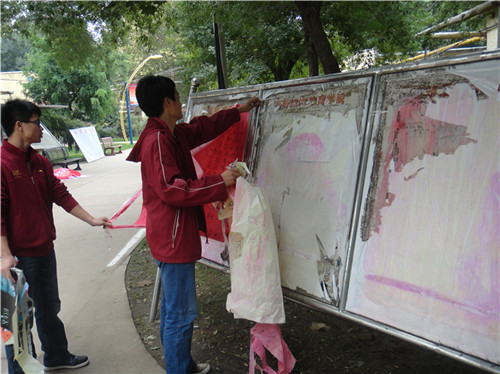 宣传栏太久没有清理,不仅堆积了厚厚的灰尘,日积月累的海报及各种附着物使清理工作很难开展。撕、铲、刷、擦……同学们想尽各种办法认真清理,清洗完之后,再把还需要展示的海报重新贴回宣传栏。经过近一个小时的努力,宣传栏在同学们的手中焕然一新。看到宣传板上的各种垃圾广告和污垢在自己的努力下一点点消失,同学们脸上露出了发自内心快乐的笑容。