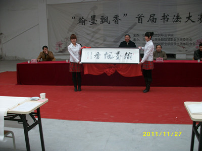 上午10时30分,大赛开幕式在大学生活动中心举行。开幕式上,杨磊处长代表学校对各校的参赛选手的到来表示热烈欢迎,并预祝参赛选手在比赛中取得优异成绩。随后,刘大文校长将内容为“翰墨飘香”的书法作品赠予了我校书法协会,并对参赛选手进行了鼓励,他希望参赛的选手能够把历代书法名家的崇高品德,当做一面镜子,激励自己以德治书,以德治学,做中华传统文化的继承着、发扬者。