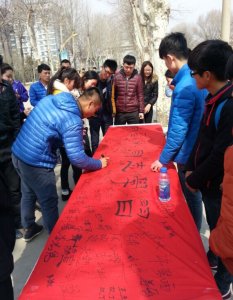活动持续了一个小时,条幅上已经签满了密密麻麻的名字。中午1点活动正式结束。随着签字活动的开始,我校2015年“雷锋月”活动已正式拉开帷幕,后续我校青年志愿者将会在课余时间对村里的孤寡老人进行帮扶活动。