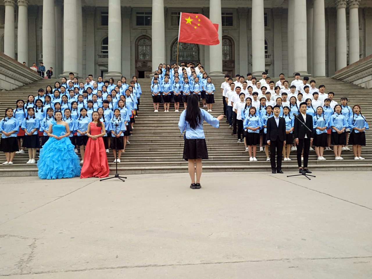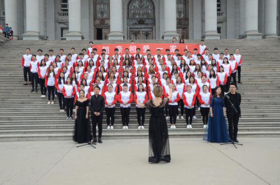艺术学院学生穿着具有时代特色的服装,用那慷慨激昂的声音震撼了每一位观众。我们的领唱,我们的指挥,我们的每一位同学,把对祖国的热爱和自己的激情融入其中,给大家带来了一场视听盛宴。