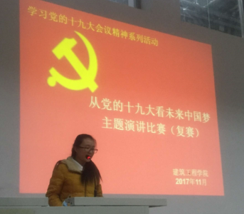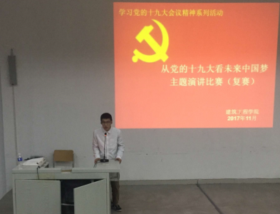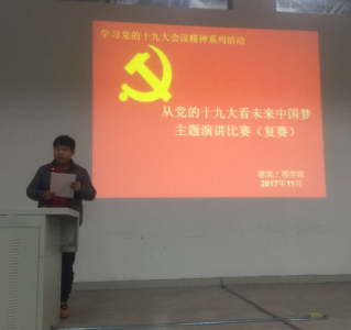 为了广泛宣传党的十九大精神,学习习近平总书记系列重要讲话中的新理念、新战略、新思想,坚定大学生政治立场,培育大学生爱国精神,传播社会主义先进文化。2017年11月16日,建筑工程学院在第四报告厅开展了学习党十九大会议精神系列活动之“从党的十九大看未来中国梦”演讲比赛,学院常务副书记李鸿涛、学生管理副院长周光奇、团总支书记王栋、李志伟老师、徐亚勇老师到场参加并担任评委,陈彦章、刘宏伟、孙丰超等11名选手参加比赛,建筑工程学院全体学生观摩了比赛。