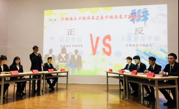 本次辩论赛四强选手分别是:健康学院、智能制造学院、财贸学院、工商管理学院;第一场由正方工商管理学院辩论题目为“宁做鸡头不做凤尾”、反方健康学院辩论题目为“宁做凤尾不做鸡头”双方展开激烈的唇枪舌战,在攻辩环节双方辩手显然都经过了充分的准备,他们引经据典的向对方进攻,面对一些复杂的问题双方辩手巧妙地回答引得场上喝彩声连连。在自由辩论环节双方辩手思维敏捷,他们据理力争、引经据典、思维严密,句句切中对方要害,不给对手留下任何破绽,充分展示了我校大学生的雄辩才能。双方选手紧抓对方论点的漏洞一一发问,细节偏颇之处进行一一击破。在最后的总结陈词阶段双方辩手运用经典的事例、严谨诙谐的措辞来例证自己的观点,赢得观众们的阵阵掌声。最终健康学院以微弱优势险胜,取得了本届辩论赛的两支决赛名额之一。