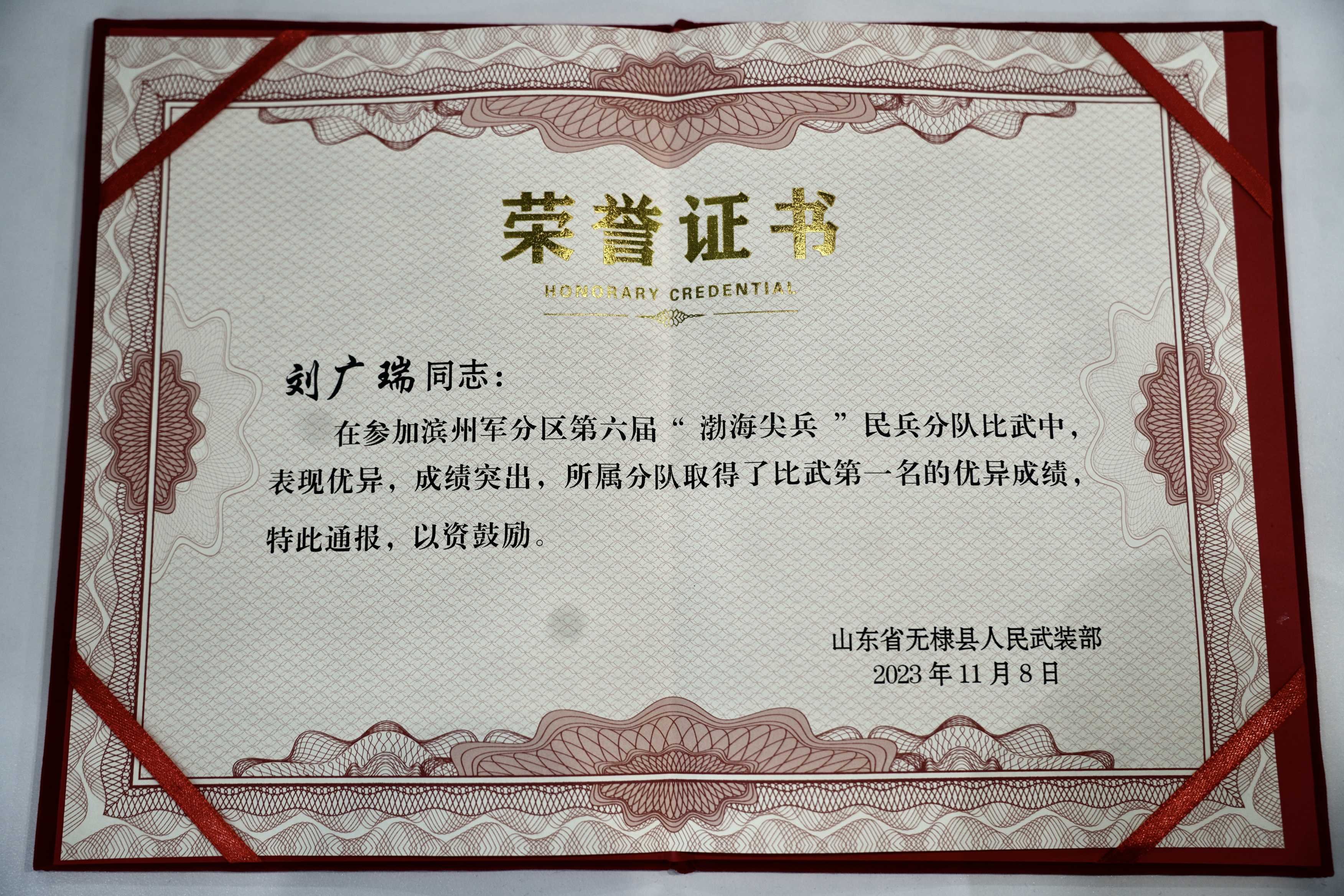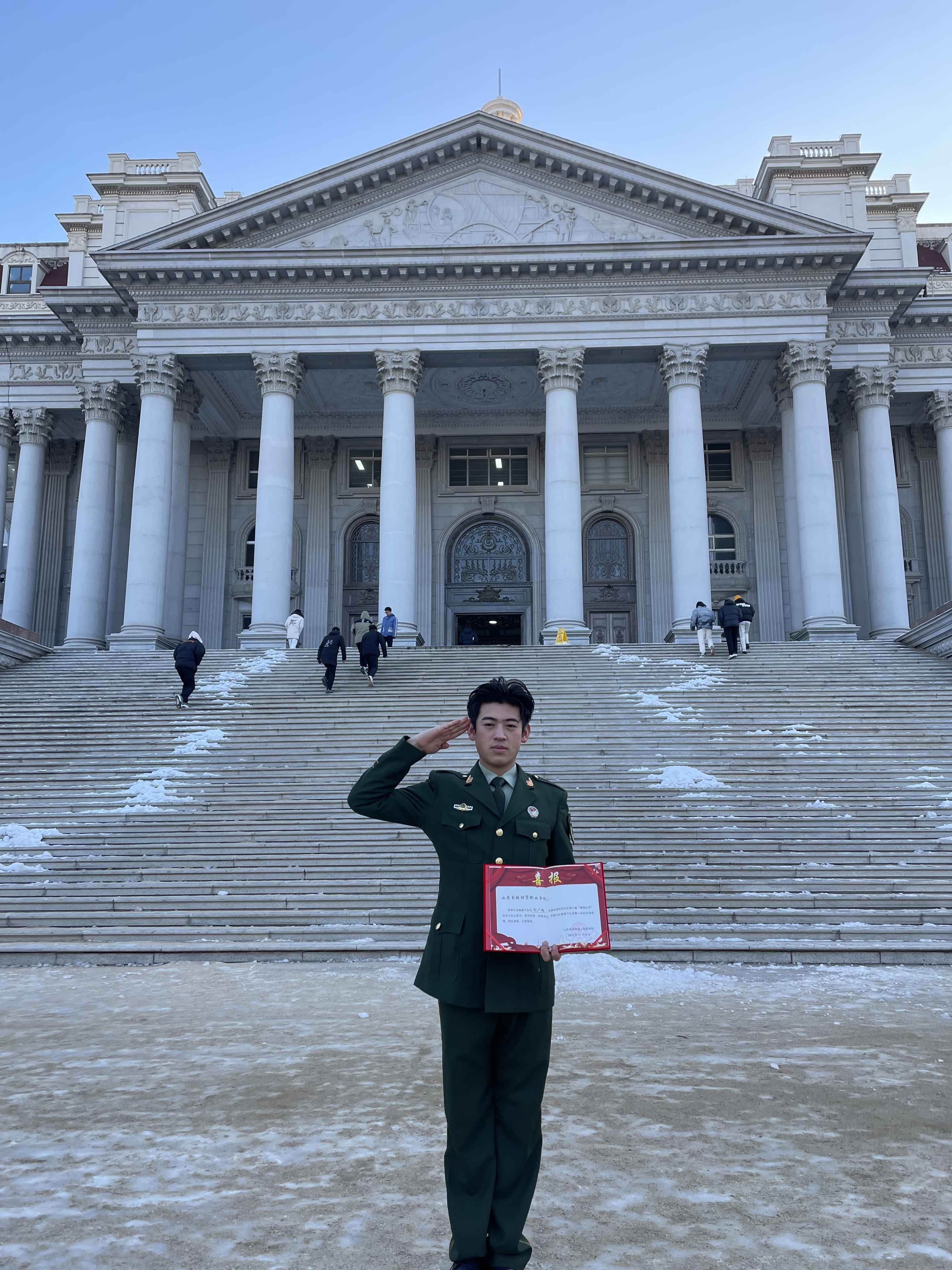 刘广瑞,2022级工程造价技术2班,从军两年,曾服役于安徽空军某部队,2023年11月8日他参加滨州军分区第六届渤海尖兵民兵分队比武,所属分队比武第一名的好成绩。也在服役期间获得四有优秀士兵、精武标兵、岗位尖兵等荣誉。