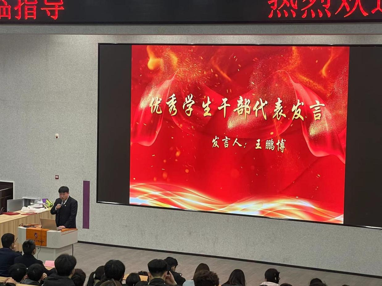 大会第五项由优秀学生干部代表王鹏博发言,以自身的工作经历来深切嘱咐学生干部应始终铭记这三点:在思想上,要敢做学生中的引领者;在学习上,要争做学业上的排头兵;在工作中,要勇做工作中的用心人。
