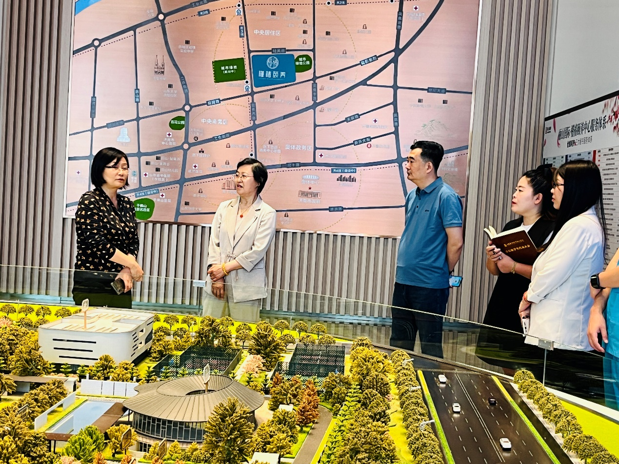 师生实地参观了丽山国际·槿椿颐养中心,槿椿颐养是国企历下控股旗下康养品牌,以CCRC可持续照料退休社区为设计理念,提供高品质医养结合护理服务,中心从自理、介助、介护到全护,为全生命周期长者提供一站式健康养老服务。整个中心以细致的适老化设计、精妆宜居的空间为老年人提供适宜的生活环境,中心内设有三大秘书服务体系,包括生活服务、健康服务、快乐服务,为老年人进行全维呵护。并将智慧养老充分融入,以“1+3+5+N”智慧养老服务体系为依托,致力打造“互联网+智慧养老”示范社区。