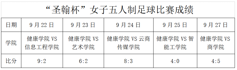在接下来的几场比赛中,学院女足顽强拼搏,积极进取,取得了优异的成绩。9月23日健康学院6:2战胜艺术学院;9月24日健康学院8:3战胜云商传媒学院;健康学院4:0战胜智能工学院;9月27日健康学院4:4战平商学院,点球决定胜负,最终4:5不敌商学院。