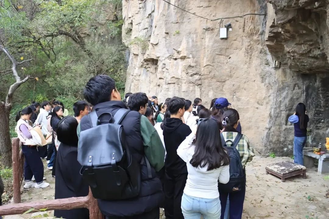 同学们还观赏了省级文物保护单位——隋唐摩崖石刻,同学们相互鼓励、步步登高,实地感受张夏独特的秋日氛围。工作人员给同学们讲解了王泉村乡村文旅发展历程,校地融合、大学城创新创造实践基地情况,希望更多的青年学子到张夏创新创业,共谋发展。
